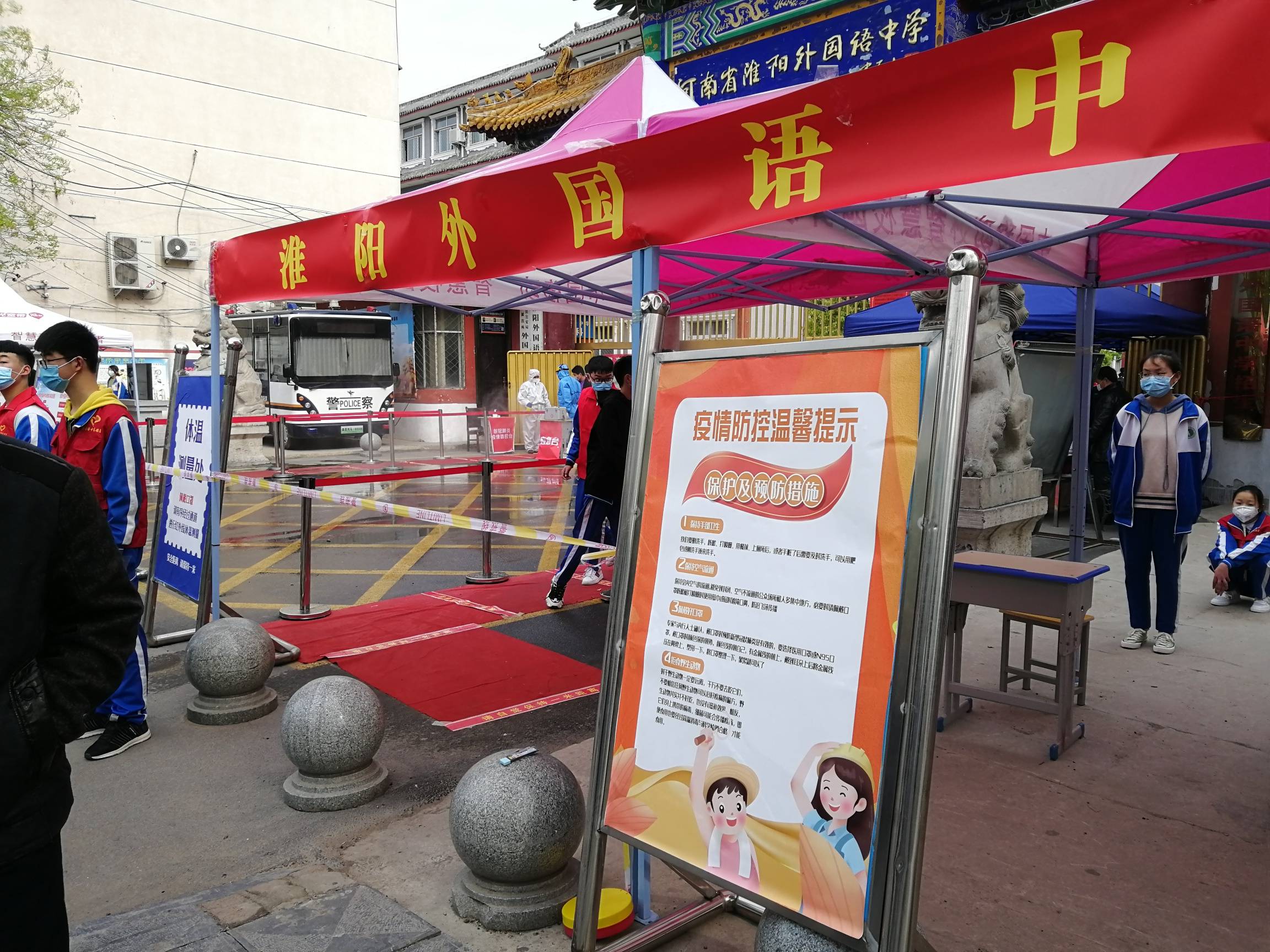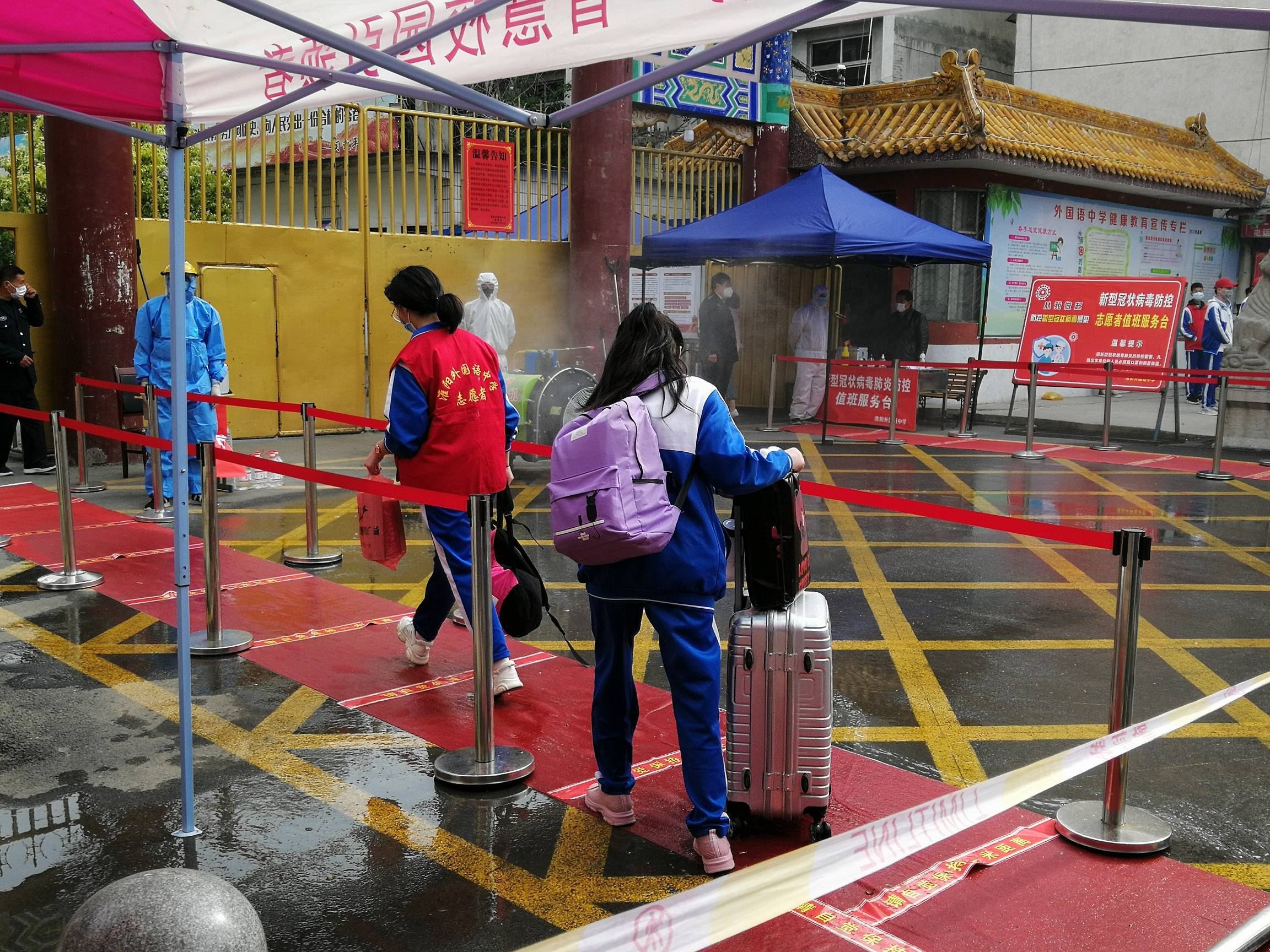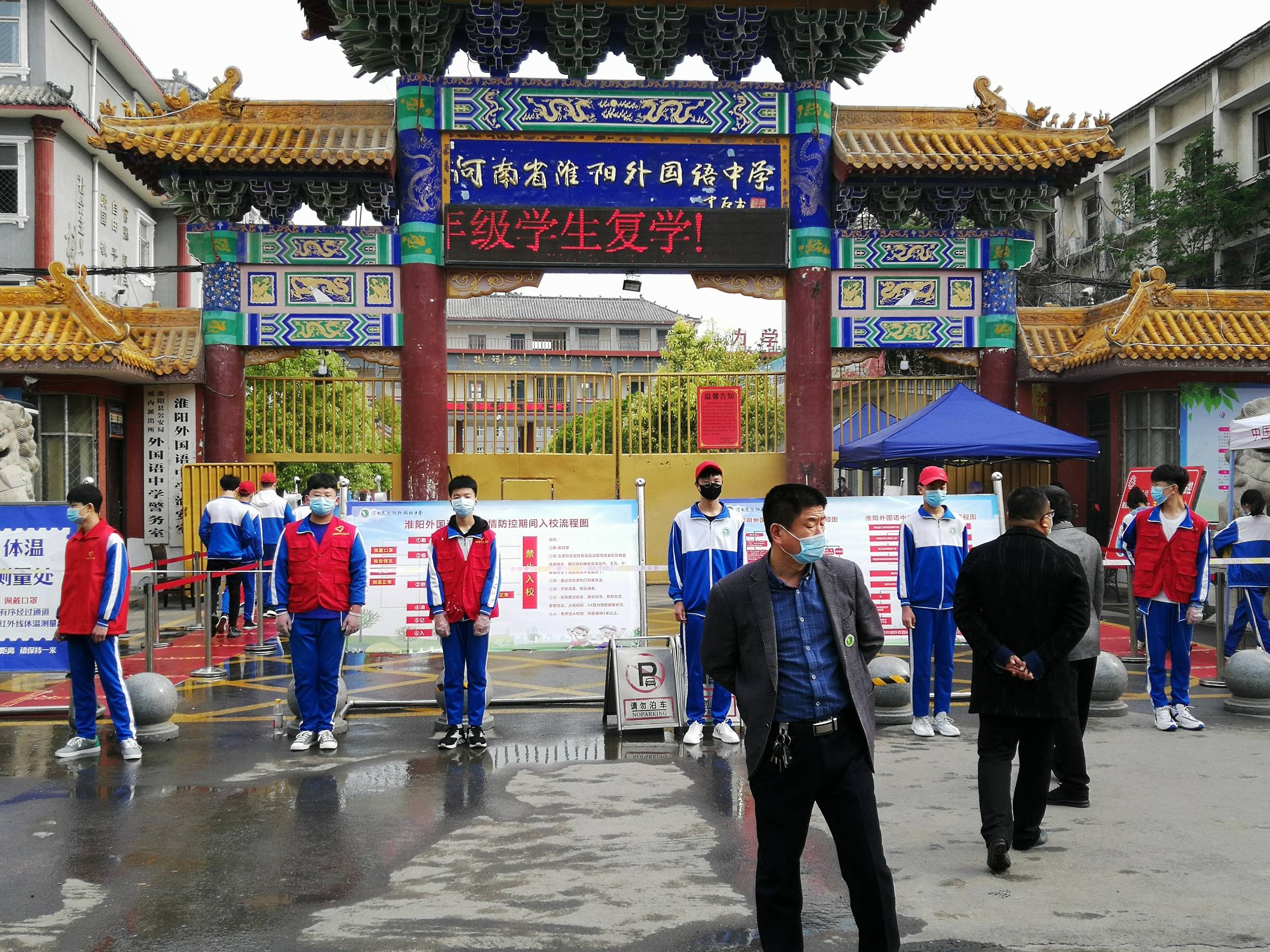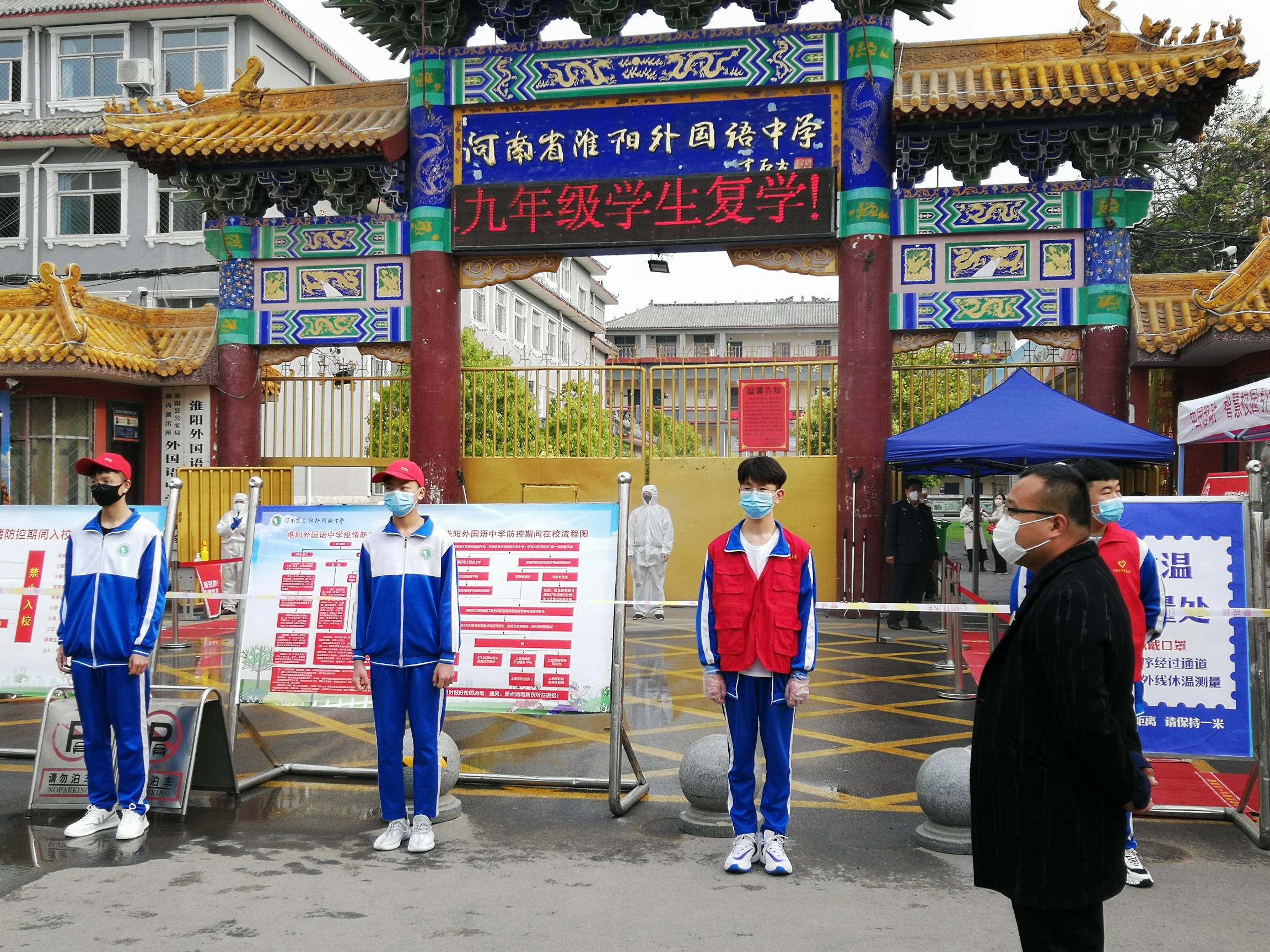 区外国语中学门口,记者看到该校为迎接学生安全返校,制订了科学的疫情防控措施 ,学生佩戴口罩,经过登记,走消毒通道,有序进入校园。