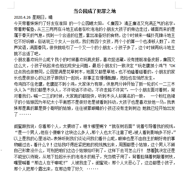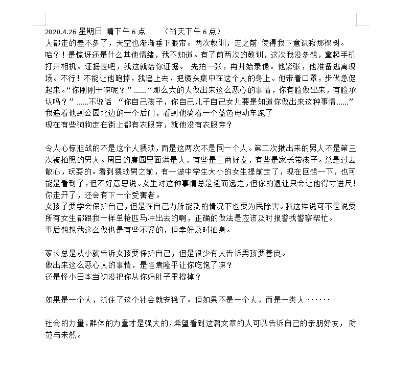 哈?!是惊讶还是什么其他情绪,我不知道。有了前两次的教训,这次我没多想,拿起手机打开相机。证据是吧,我这就给你证据。 先拍一张,再开始录像。他紧张,他准备逃离现场。不行!不能让他跑掉,我追上去,把镜头集中在这个人的身上。他带着口罩,步伐急促起来。“你刚刚干嘛呢?”......“那么大的人做出来这么恶心的事情,你有脸做出来,有脸承认吗?”......不说话 “你自己孩子,你自己儿子自己女儿要是知道你做出来这种事情......”