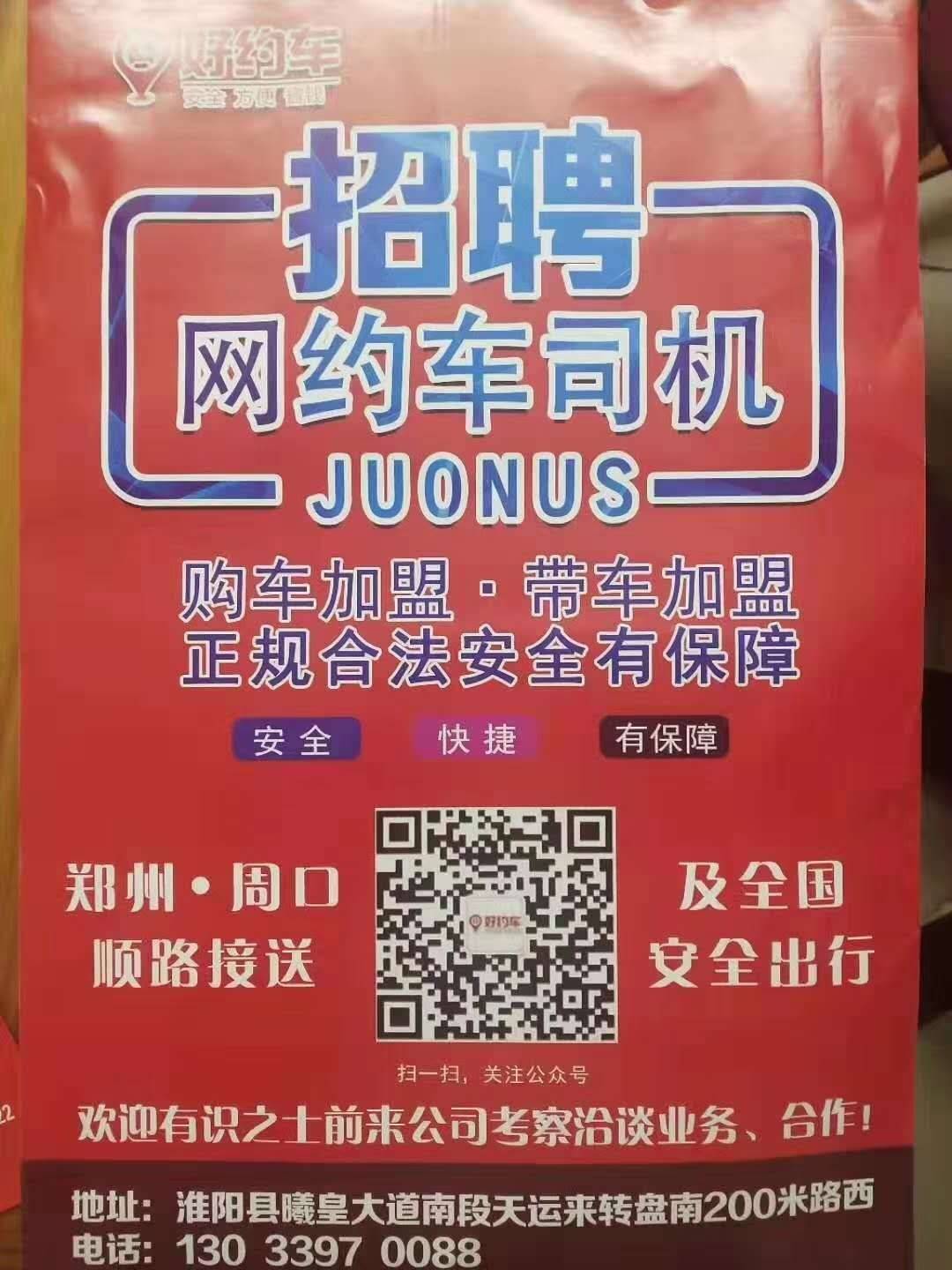 大家好,我是好约车网约车周口服务有限公司淮阳分公司的负责人,我们公司资金雄厚,目前是周口市网约车服务最手续齐全合法的龙头企业,供你选择车型多, (各种七座五座,车型,价格低,自由选),也可带车加入。营运证,网约车资格证下证快!营运抽成,管理费低,如果你是正在营运的七座中短途车主或想要加入网约车服务的人员!欢迎你到公司参观考察!公司地址:淮阳羲皇大道南段天运来转盘往南二百米路西,电话2691998,13033970088杨经理