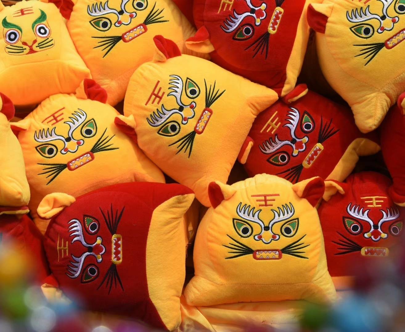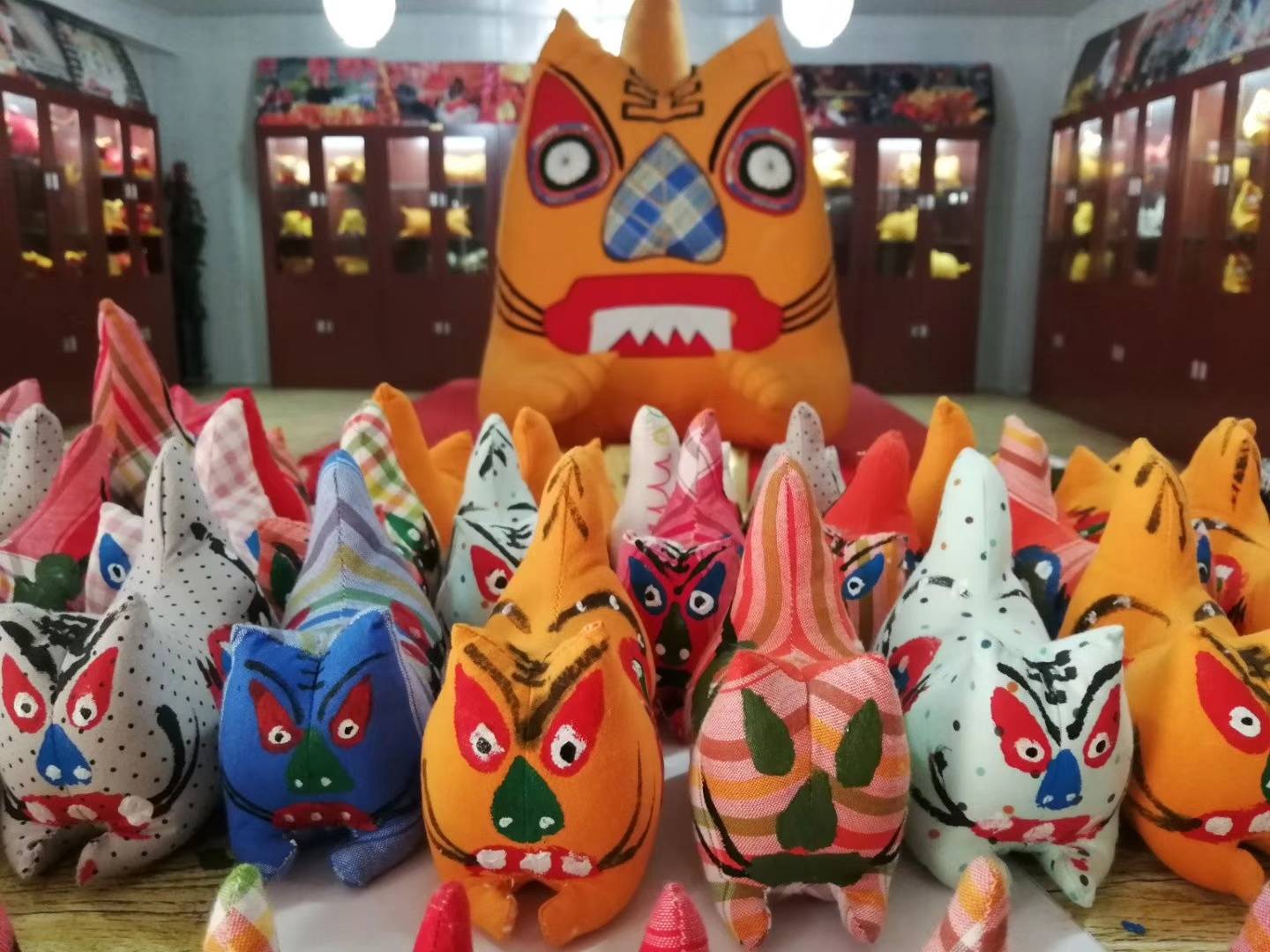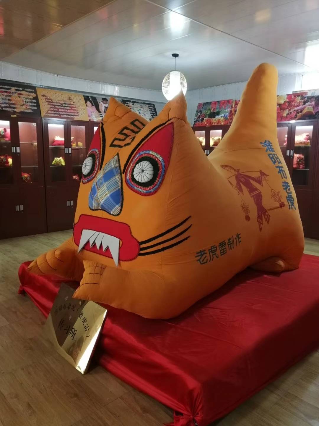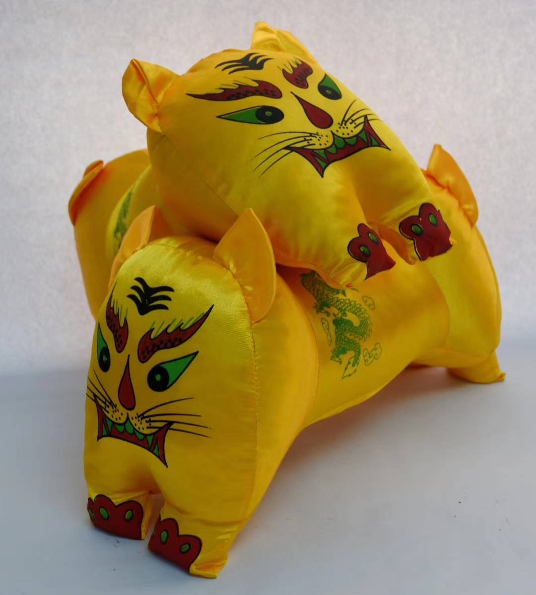 “布老虎”源自伏羲女娲成婚的神话传说。相传在上古时代,由于天塌地陷,人间只剩下伏羲、女娲兄妹二人,为繁衍人类,他们各自去寻找配偶,但寻遍无人,无奈便以滚磨为媒,结为夫妻。伏羲羞与见妹妹,便扮成老虎模样,以草帽遮面,与其妹成亲,才使华夏民族得以延续至今,所以“布老虎”其实不只是普通意义的布玩具,他更是早期人类繁衍崇拜的一个物化见证。淮阳“布老虎”非物质文化遗产传承人雷智超,现任