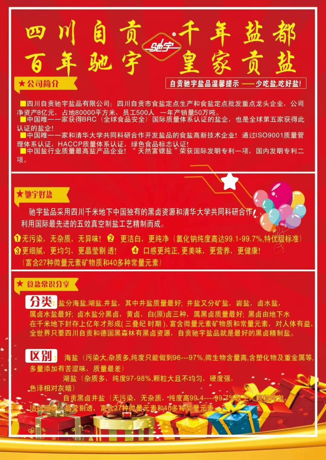 四川自贡,千年盐都,百年驰宇,皇家贡盐。驰宇盐品,中国唯一一家和清华大学共同研发的高新技术盐企,在国内乃至全世界都是市面上盐品质量最好的食盐,千里配送,好盐不贵,你值得品尝! 优秀渠道招募中……