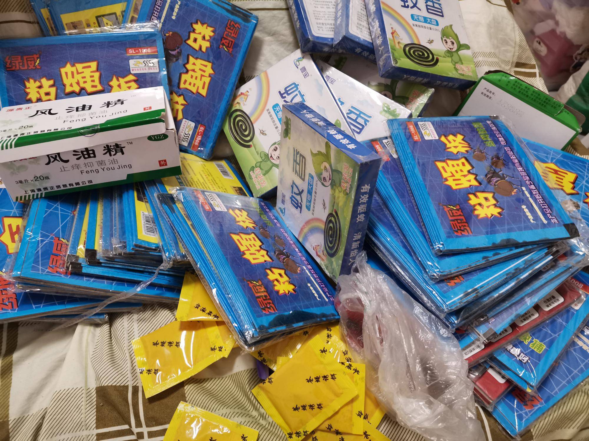 粘蝇板十元三十贴,蚊香十元四盒,老鼠贴十元四张,风油精二元一瓶,清凉油一元一个