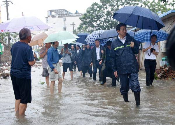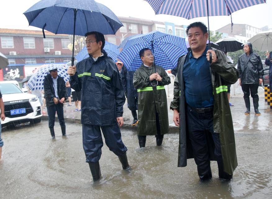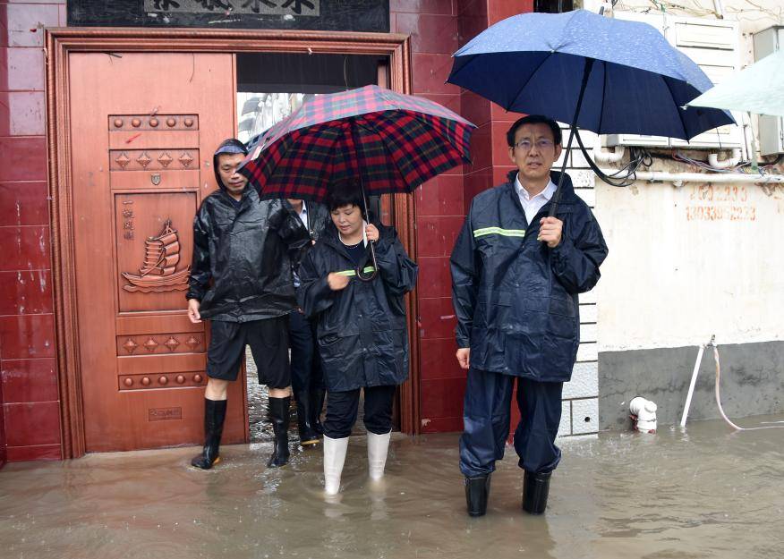 马明超一行冒雨深入到陈州路与新兴路口、陈州路与文明路口、润德广场、龙湖边、老城区淮师家属院、区委家属院等老旧小区现场查看排涝情况,并到居民家中查看房屋是否漏雨、有无积水。