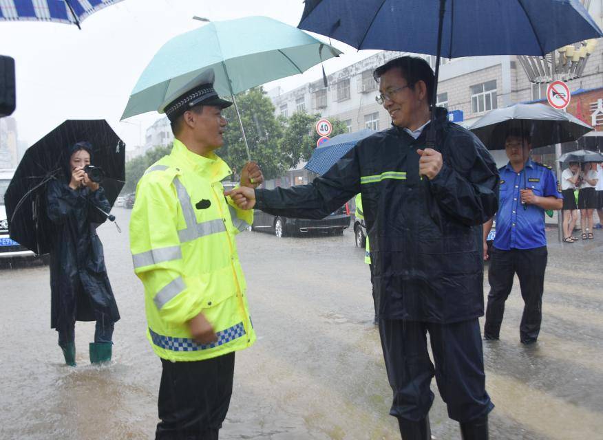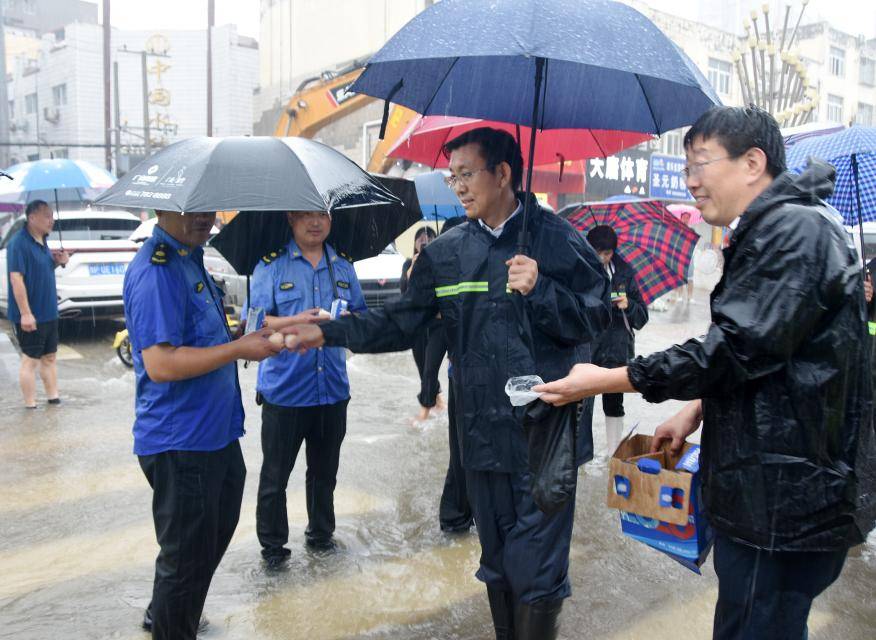 在陈州路与文明路路口,马明超亲切慰问值勤的交警、城管队员,感谢他们冒雨值勤,为城市有序运转、群众生命财产安全护航。