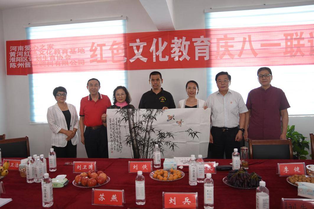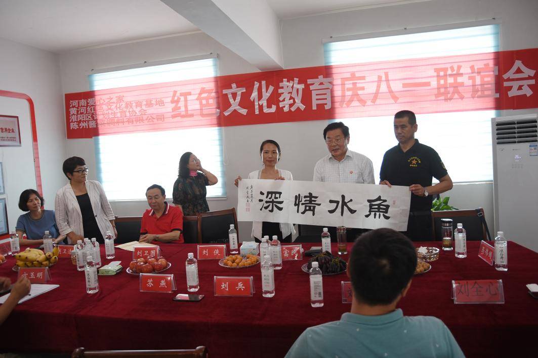 区办公室、淮阳区计生协、陈州酱菜调料有限公司、赵玲文化艺术学校“帮企业、促发展、庆八一”联谊会在陈州酱菜调料有限公司三楼会议室召开。河南省爱心之家协会会长刘侠,河南省军区原副参谋长刘卫国,河南省委宣传部原副巡视员刘富民,河南省经协刘先杰,周口市淮阳区政协副主席兼工商联主席刘卫洁,著名书法家李健,淮阳区幸福工程项目办公室主任方玉明,淮阳区摄协副主席袁东升,淮阳赵玲文化艺术学校校长赵玲,陈州鸿儒书画院院长刘全新,陈州酱菜有限公司董事长苏燕,执行董事马伟国、董事李永奇、刘兵,淮阳区卫健委妇幼股股长张运体、培训中心主任刘廷喜、淮阳区计生协会秘书长李中勇等同志参加了联谊会活动。