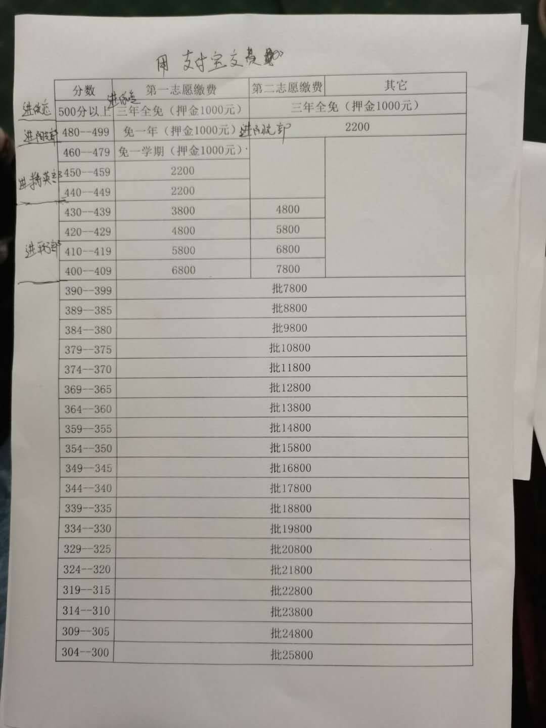 480一499分,免一年学费,交押金1000元,入阳光班