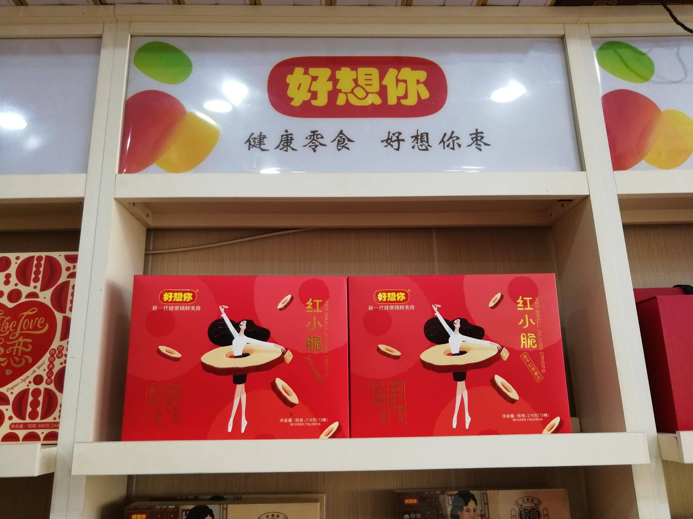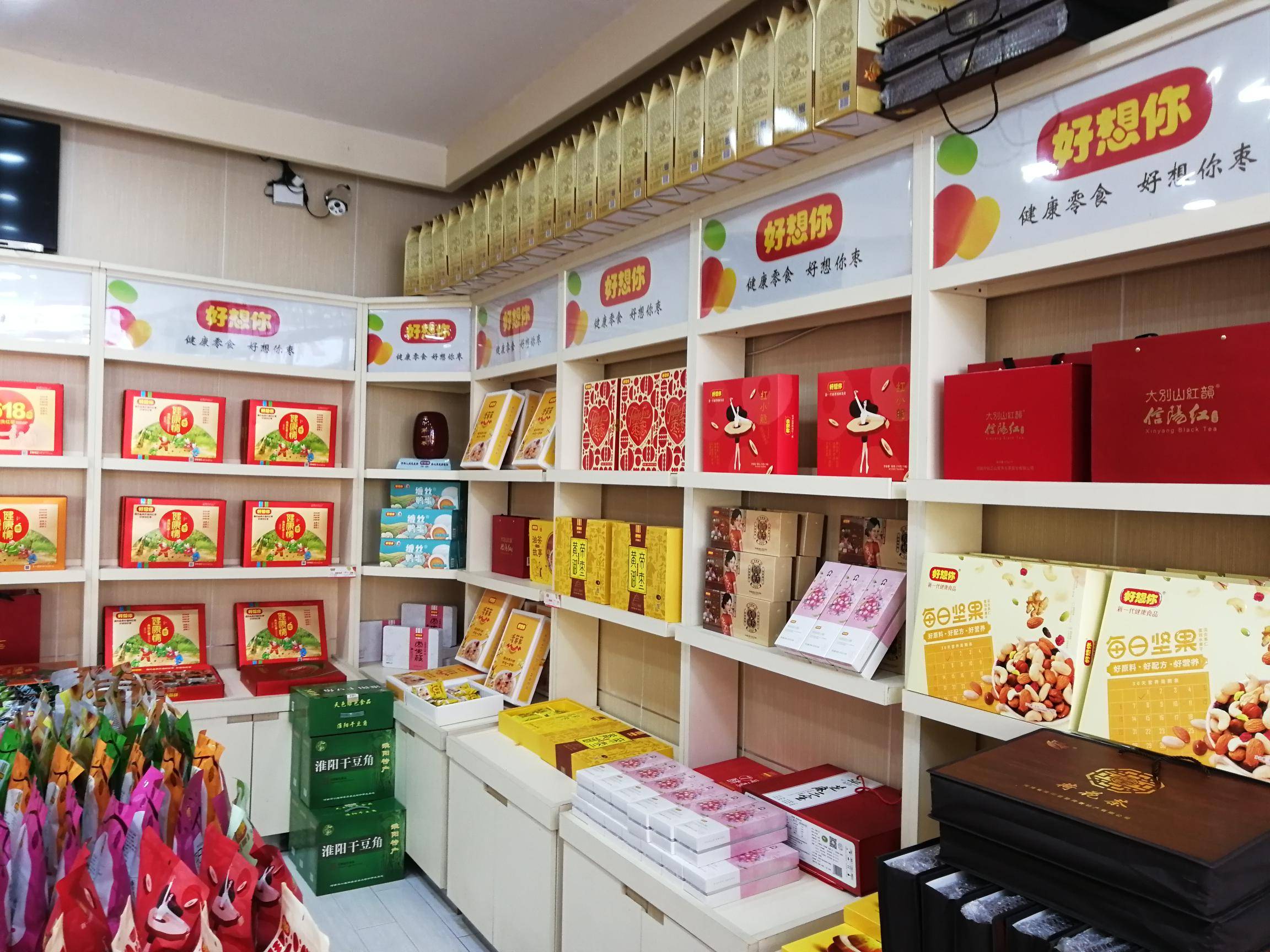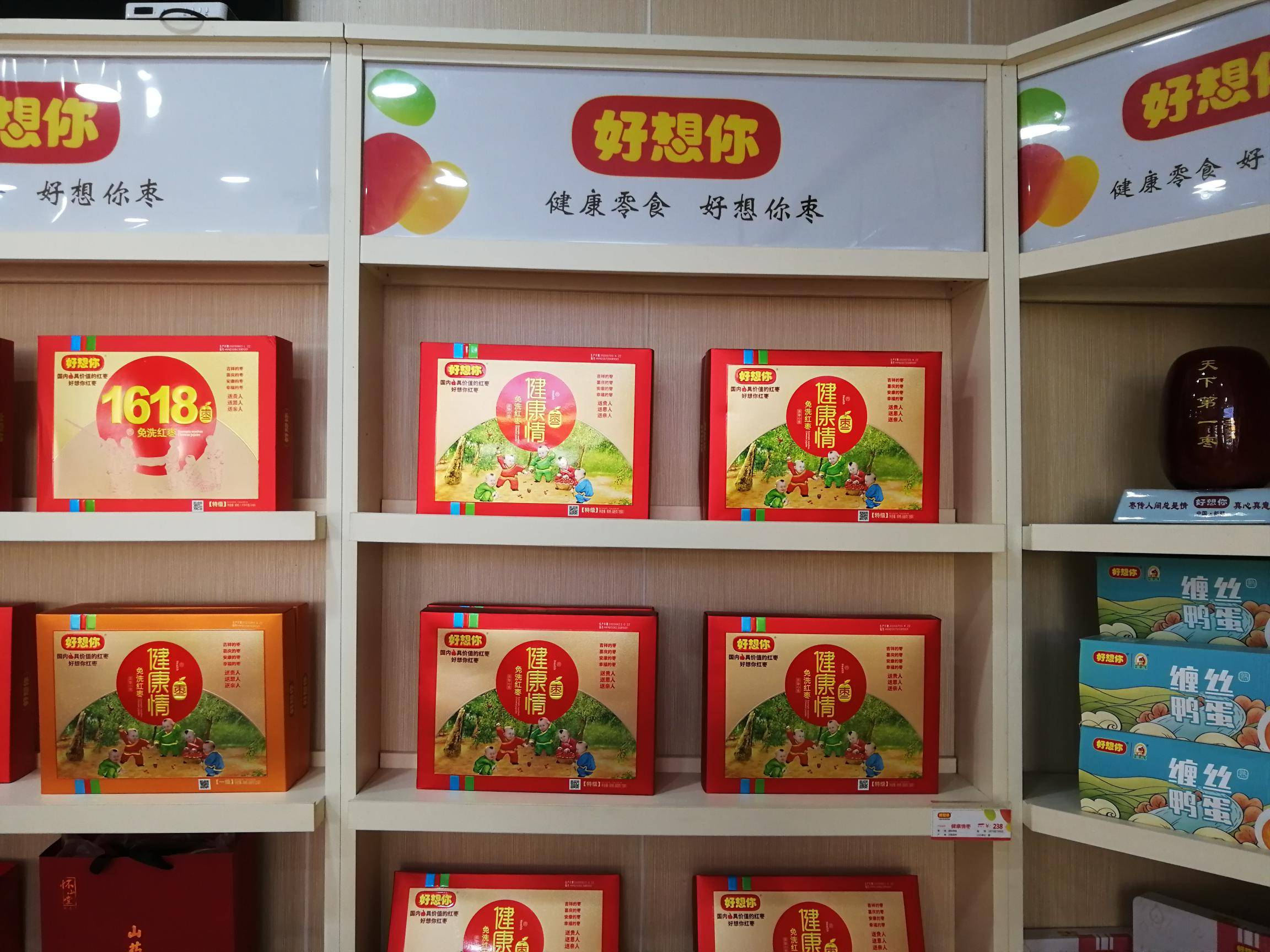 “好想你”专卖店主要经营好想你枣、铁棍山药、信阳毛尖等河南名优特产。 好想你枣是一家集红枣种植加工、冷藏保鲜、科技研发、贸易出口、观光旅游为一体的综合型企业。目前已成为红枣行业规模最大、技术最先进、产品种类最多、销售网络覆盖最全、辐射带动最广、市场占有率最高的龙头企业。 近年来,公司获得国家农业产业化重点龙头企业、农业产业化行业十强龙头企业称号、全国农产品加工业出口示范企业、国家级观光工业旅游示范企业、全国食品行业优秀食品龙头企业、 全国枣产业骨干龙头企业,公司制定的免洗红枣标准被国家质检总局认定为国家标准;公司“好想你”、“枣博士”商标被国家商标总局认定为“中国驰名商标。