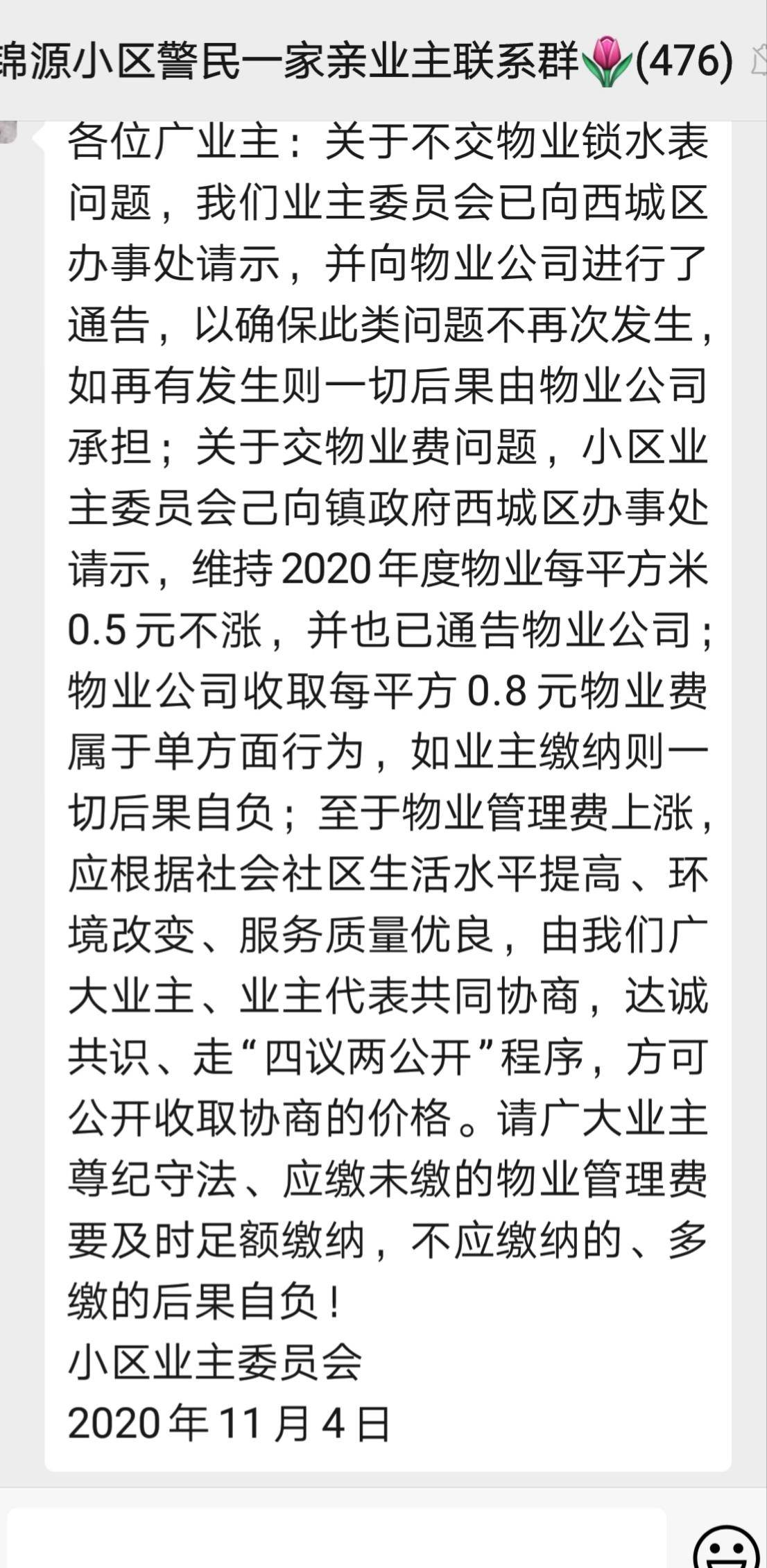 最近,锦园小区物业私自单方面把物业费从5毛涨到8毛。在小区业主委员会不同意及通告他们的情况下,据有些业主反应,他们还要收8毛。甚至,把个别业主的水表锁上,来逼迫之。小区业主每天活在惶恐不安之中,深怕自家的水表被锁。希望各方面能处理一下,能让锦园小区业主恢复正常的安心的生活秩序。