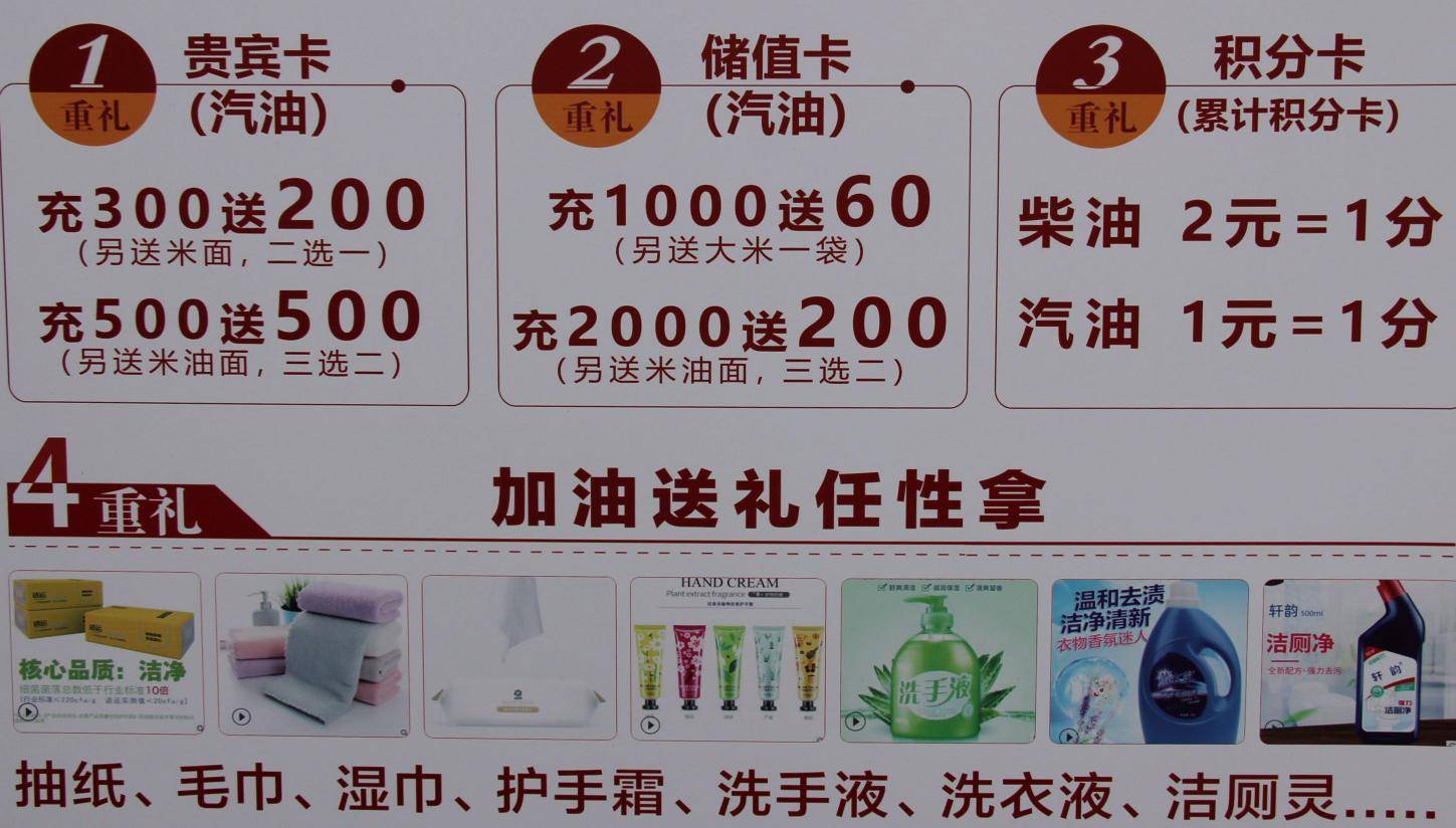 活动期间,办卡充值更实惠,办理贵宾汽油卡,充300送200,(另送米面,二选一),充500送500,(另送米面油,三选二),办理汽油储存卡,充值卡,充1000送60,(送大米一袋),充2000,送200,(另送米面油三选二),!办理积分卡,面油,三选二)办理积分卡,柴油两元积一分,汽油一元积一分。锁定活动油价,油价上涨不慌涨。