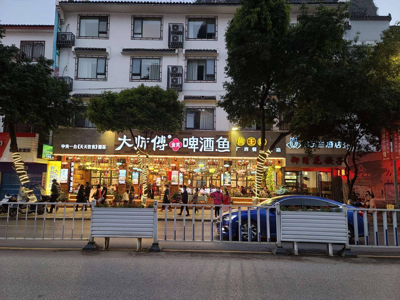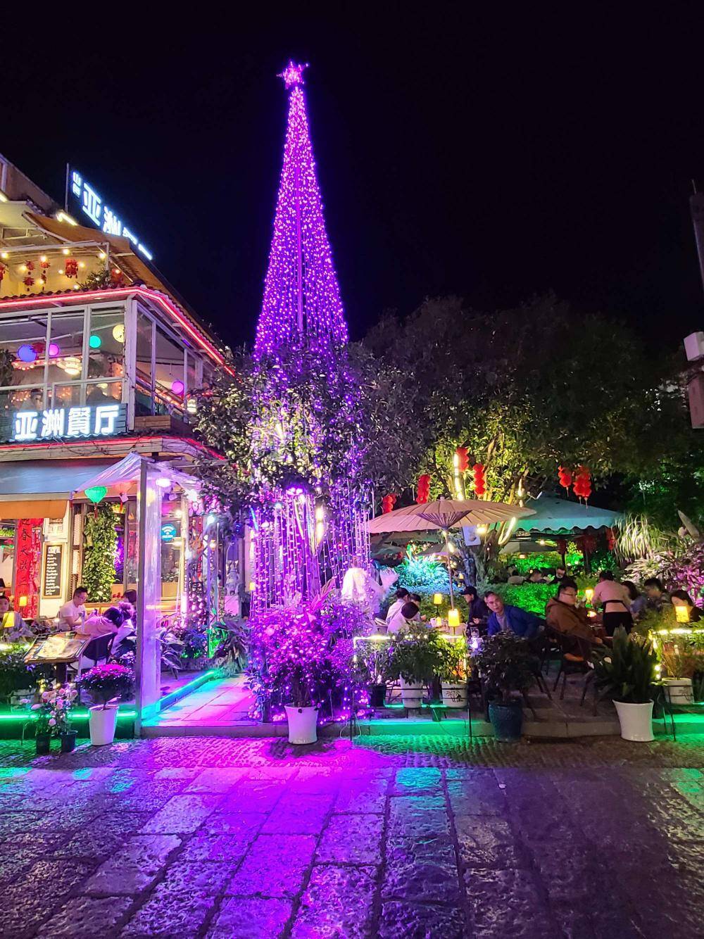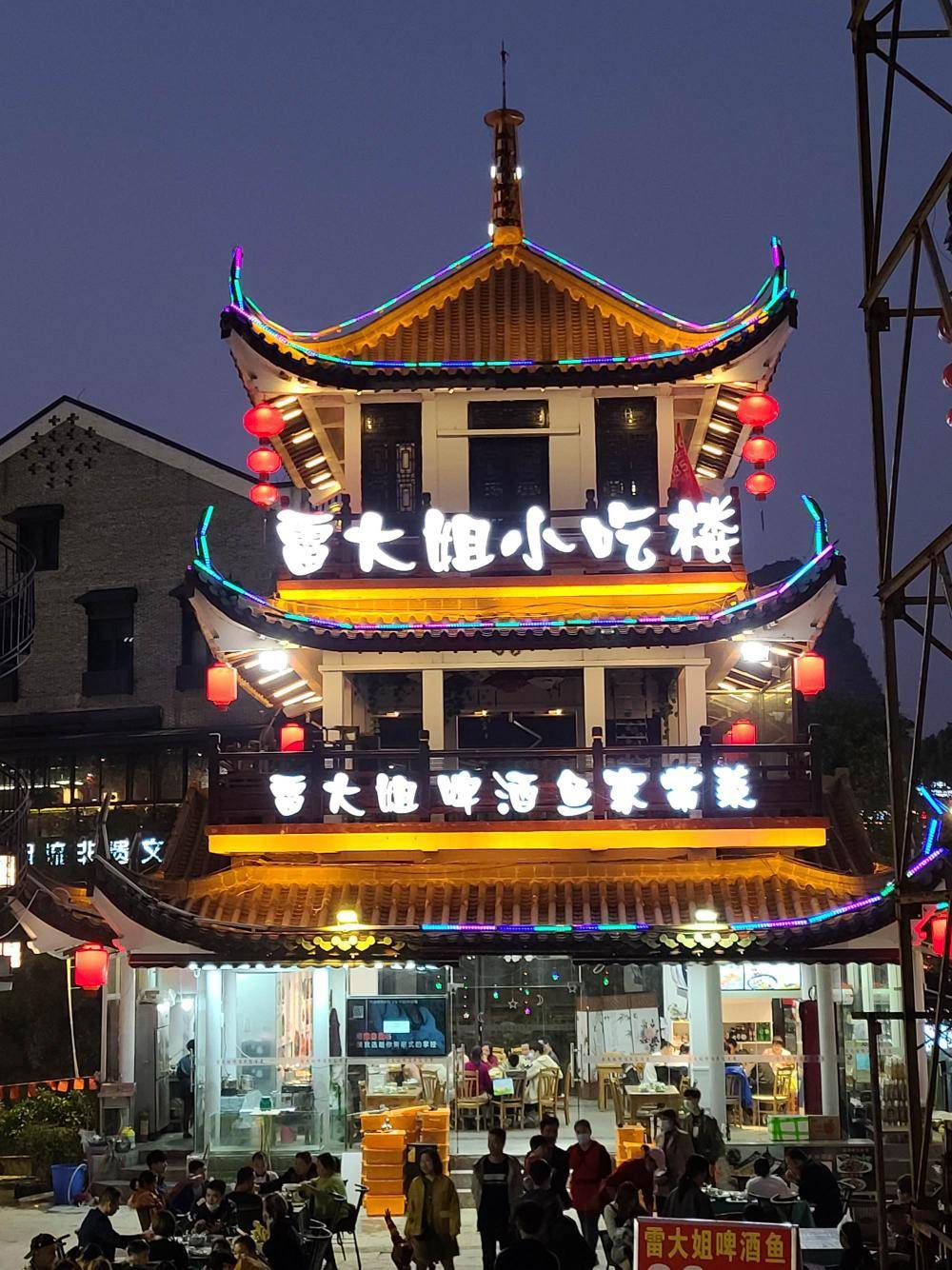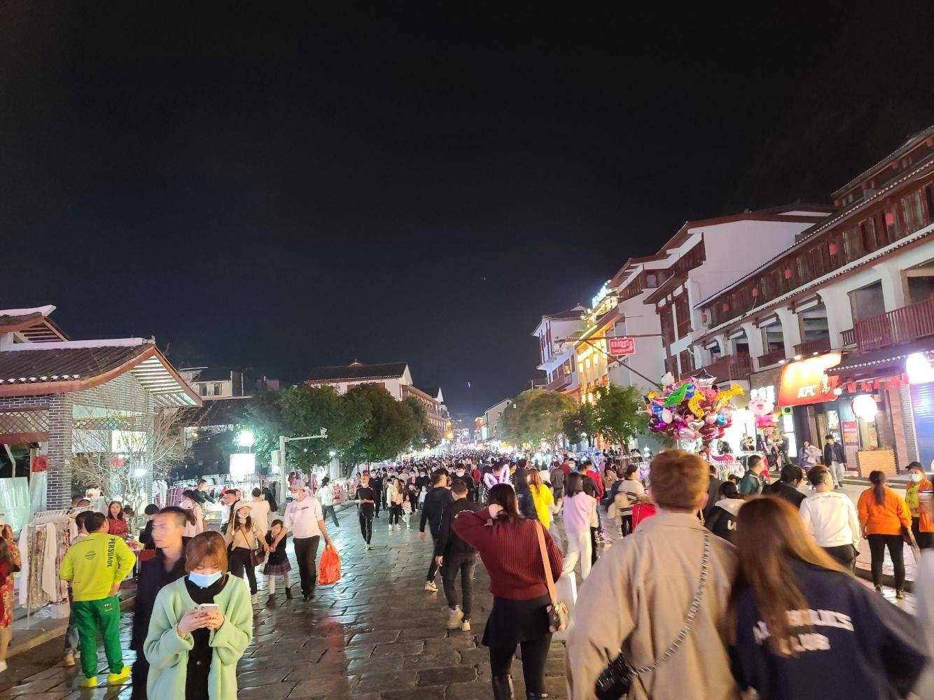 白天在漓江玩了一天晚上来到阳朔最著名的西街, 阳朔西街可以说是阳朔最具人气的地方,里面很大,酒吧、工艺品店、特产店、小吃店等等琳琅满目,而且夜生活都比较丰富,这里是个不夜天,很热闹。西街的地理位置很优越,距离阳朔汽车站只有500米左右。这里的特色菜啤酒鱼很值得一尝,鱼的口感很好,做法类似于烤鱼,味道很特别。