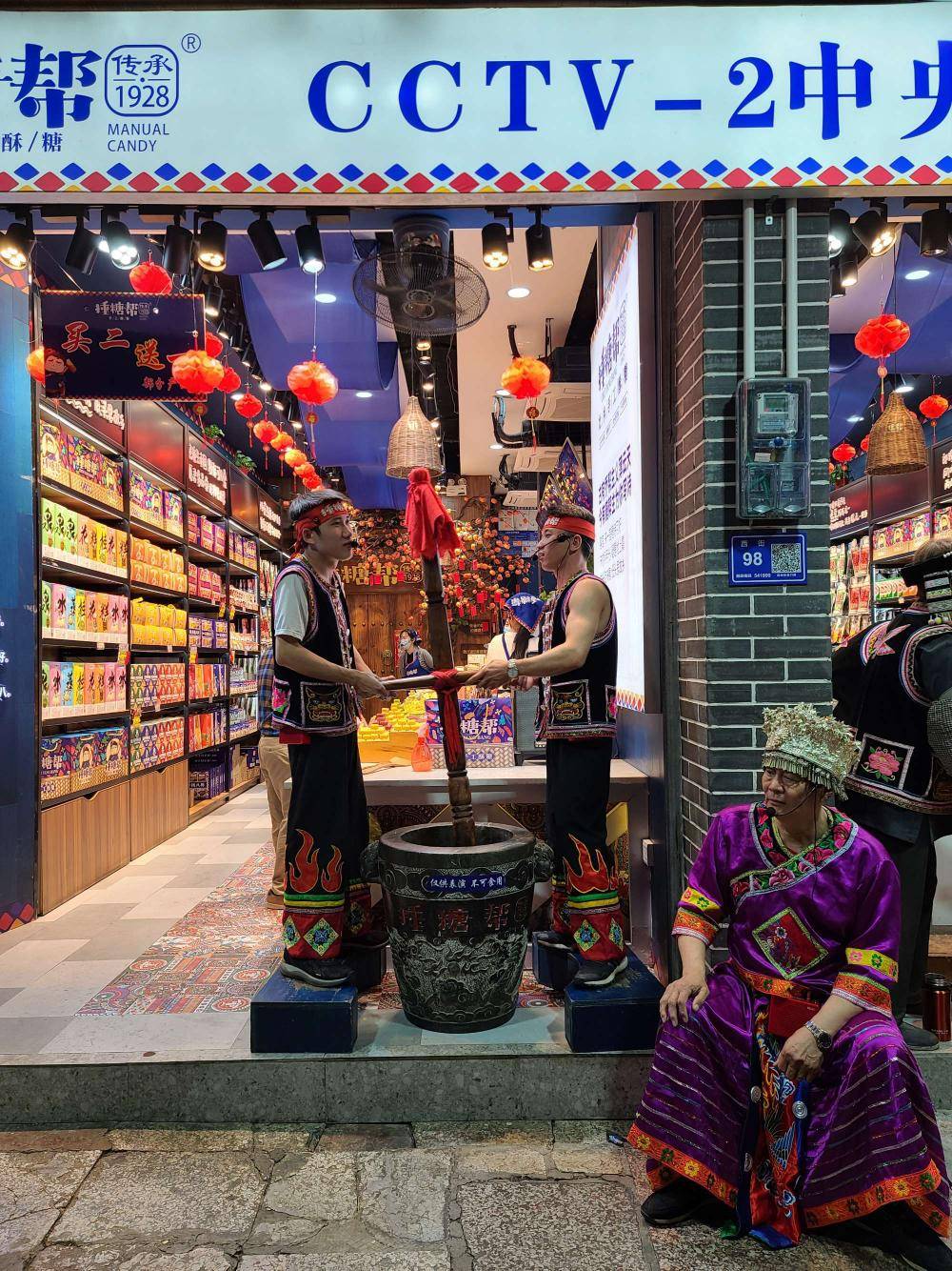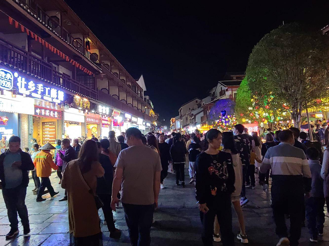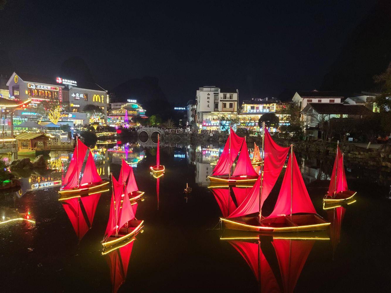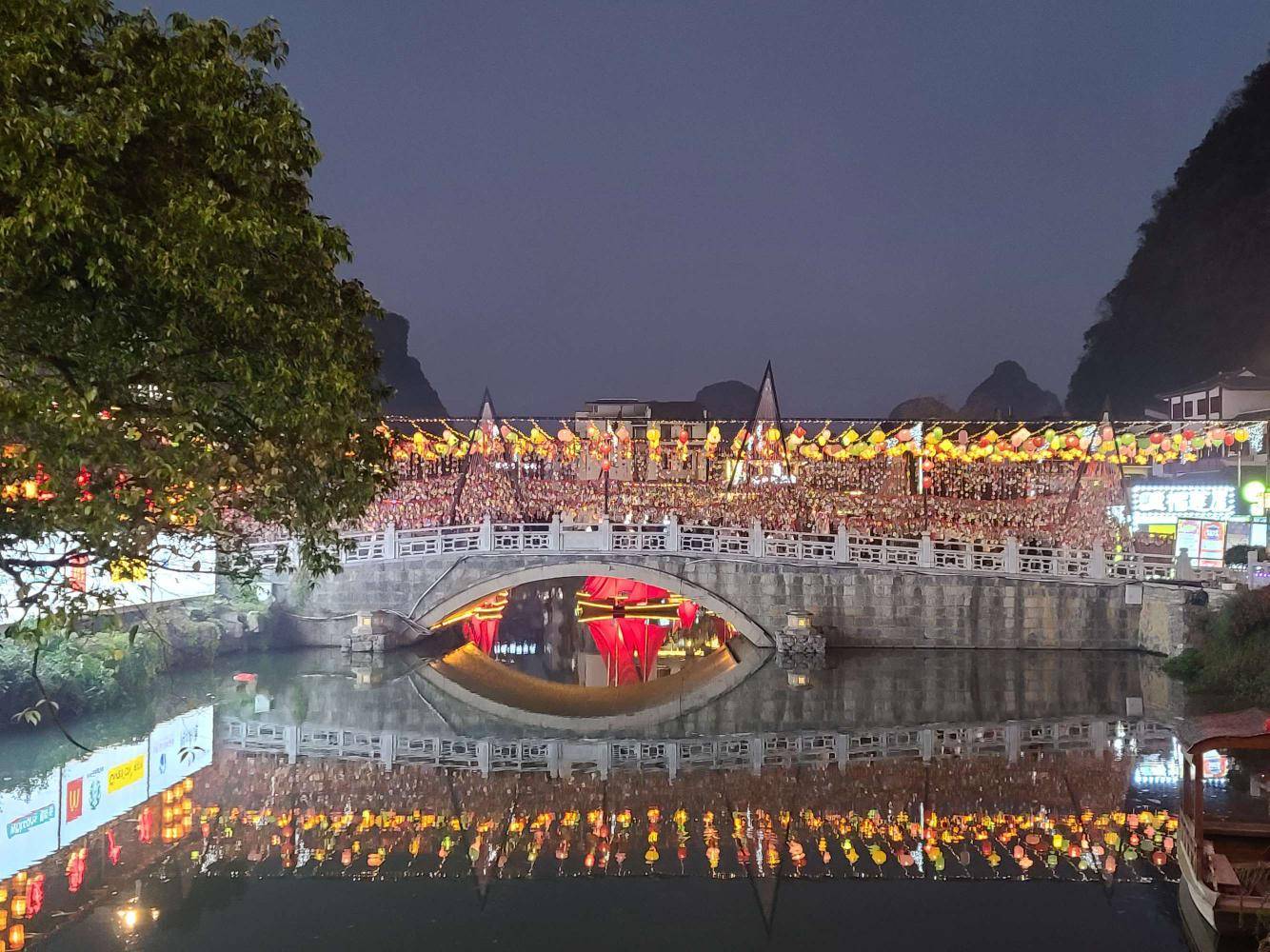 白天在漓江玩了一天晚上来到阳朔最著名的西街, 阳朔西街可以说是阳朔最具人气的地方,里面很大,酒吧、工艺品店、特产店、小吃店等等琳琅满目,而且夜生活都比较丰富,这里是个不夜天,很热闹。西街的地理位置很优越,距离阳朔汽车站只有500米左右。这里的特色菜啤酒鱼很值得一尝,鱼的口感很好,做法类似于烤鱼,味道很特别。