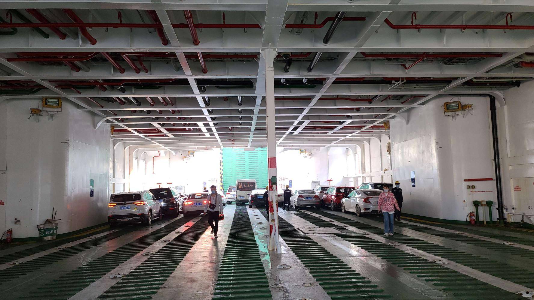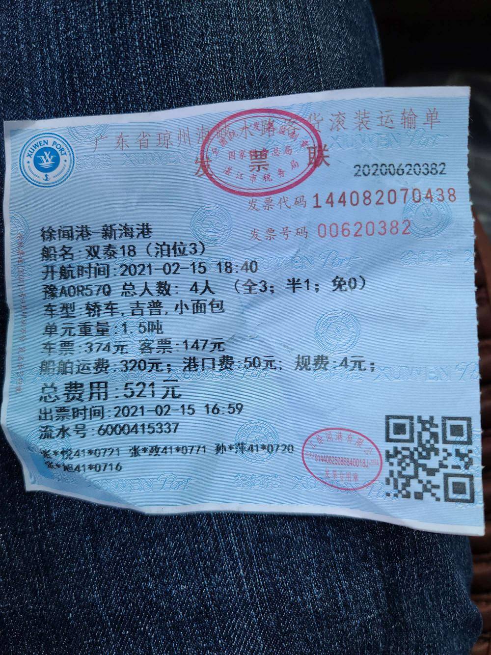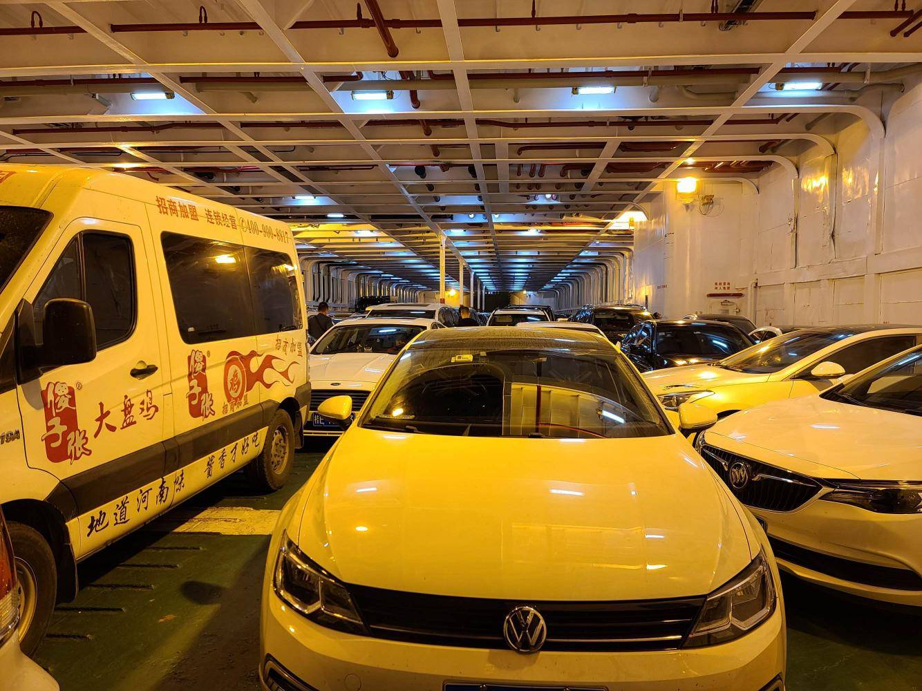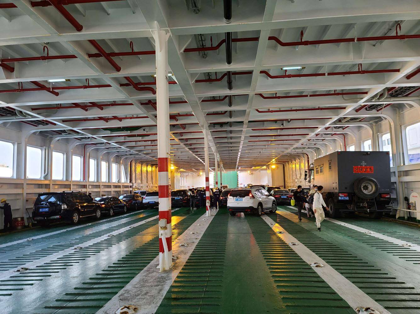 经过三天的边走边玩我们在初四下午三点来到了广东湛江徐闻港口,在自助机上买了船票,车415元含一名司机,其他人员每人41.5女儿有学生证半价优惠,买好船票需要过安检,由于不知道车上不让带液化气罐就没把做饭用的液化气罐藏起来,被安检人没收了,提醒以后来三亚的车友一定把液化气罐藏起来!过完安检车就开到船上了,货仓甲板上密密麻麻停满了车。来往海口和徐闻的车很多,为了能最大限度的多装车。这里的工作指挥员会要求你尽可能地靠近旁边的车。如果车技不过关,难免被说道一通,轮船下面是装汽车的,大船的上部是坐人的,船上卖的吃的喝的都有,由于上一个船刚开走我们等的有三个小时才开船,船在琼州海峡行驶90分钟到达海口!
