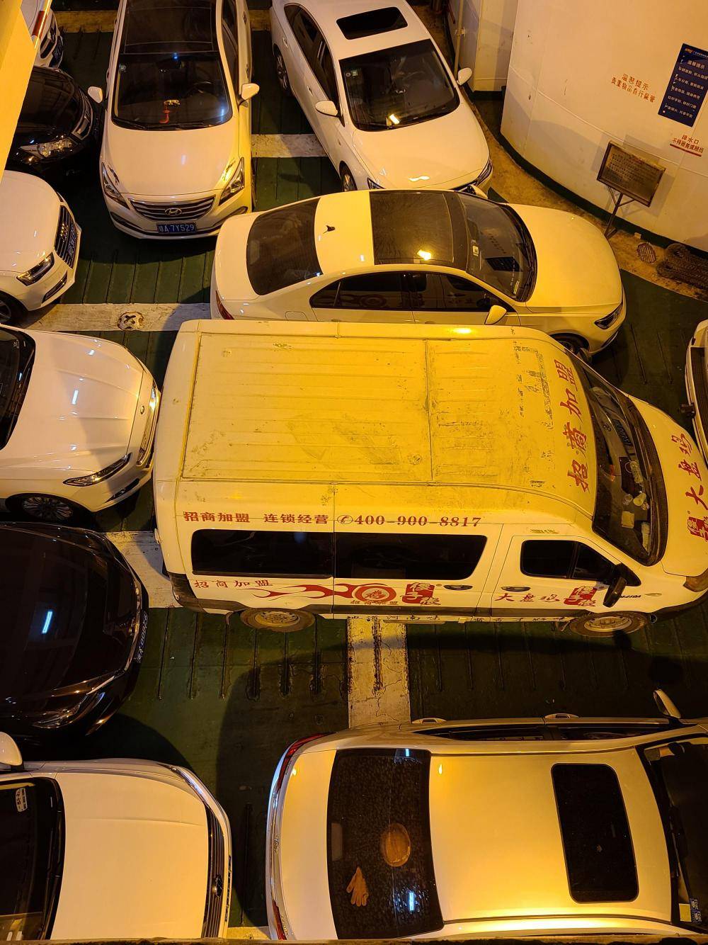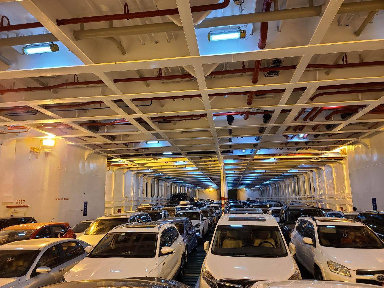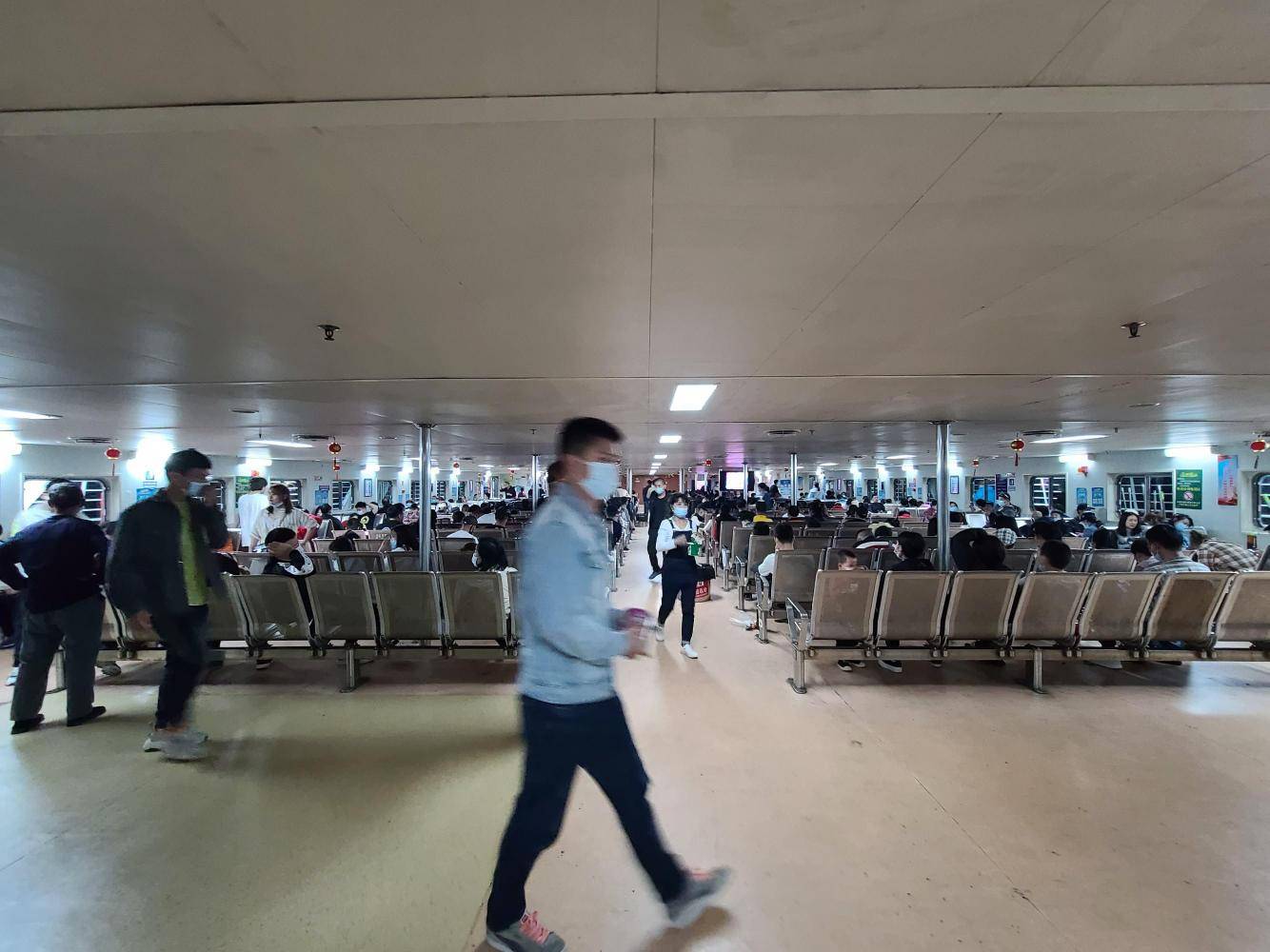 经过三天的边走边玩我们在初四下午三点来到了广东湛江徐闻港口,在自助机上买了船票,车415元含一名司机,其他人员每人41.5女儿有学生证半价优惠,买好船票需要过安检,由于不知道车上不让带液化气罐就没把做饭用的液化气罐藏起来,被安检人没收了,提醒以后来三亚的车友一定把液化气罐藏起来!过完安检车就开到船上了,货仓甲板上密密麻麻停满了车。来往海口和徐闻的车很多,为了能最大限度的多装车。这里的工作指挥员会要求你尽可能地靠近旁边的车。如果车技不过关,难免被说道一通,轮船下面是装汽车的,大船的上部是坐人的,船上卖的吃的喝的都有,由于上一个船刚开走我们等的有三个小时才开船,船在琼州海峡行驶90分钟到达海口!