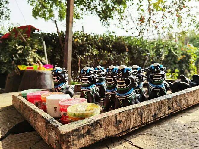 祭祀完毕,还要购买太昊陵的灵物“泥泥狗”。泥泥狗是伏羲、女娲抟土造人的“真图腾、活化石”。传说伏羲时代发生一次大地震,他们为繁衍人类不得不兄妹相婚,由于嫌自然生育太慢,就用黄土造人,所以中国人都是黄皮肤。这些泥泥狗用黄淤泥捏制,全涂黑底,然后用红、黄、白、绿、粉五色绘以点线结构的图案,有草帽老虎、人面猴、对脸人、猴头燕、双头狗等数百种造型。这些泥泥狗浑厚古朴,艳而不俗,腹部都绘有女性生殖器图案,代表着女性生殖崇拜。