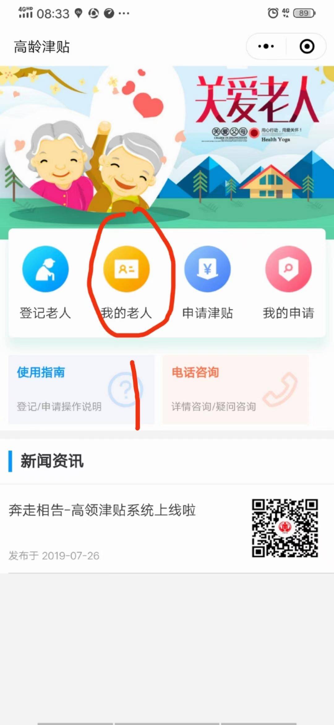 80岁以上高龄老人请抓紧时间复审认证,微信扫描二维码进入小程序,在《我的老人》选项中进行复审(我的老人中已有老人信息的直接点击复审,没有信息的点击下边的《添加老人》添加老人信息后再进行复审),不复审将会影响老人的高龄津贴待遇。
