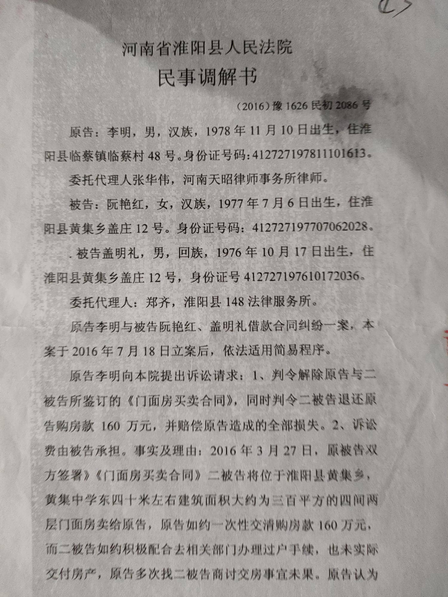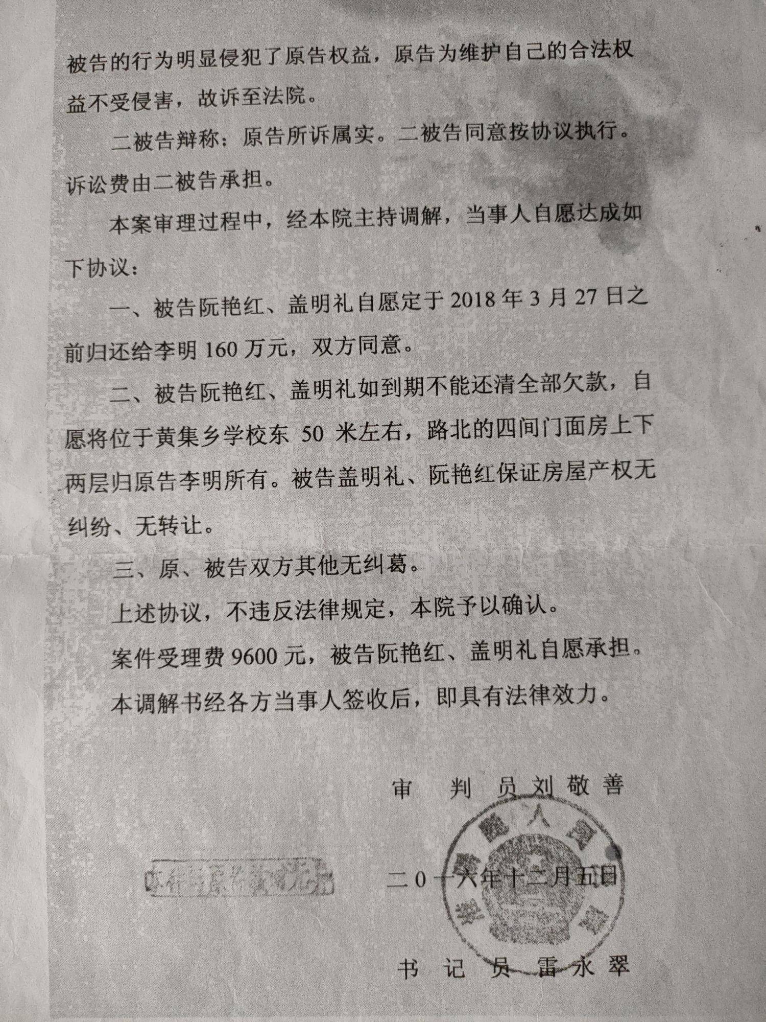 法院调解,盖明礼、阮艳红夫妇还不上160万本金,自愿将黄集街四间门面房(价值百万无证),给我内弟李明。两年分文未见,我们再次申请执行。直到2019年中秋节前,张德忠庭长才执行了1.5万元。节后我们去带人,他却故意把阮艳红支走,反被狼走咬着屁股。我给他治病、压惊、送烟酒、许干礼。他也一再安慰:“十一”前有大行动:人家媳妇该生了,待了客先凑十万……张庭长光许码不办事,院领导才同意让李法官执行。其间还欺骗我们,案子半年必须终本。我问:影响不影响执行?他信誓旦旦:“不会”。等拘留了盖明礼,张的下家——韩庭长说:没有新的财产证据不能恢复。我说封有四间门面房。他说我们是第二封。我说第一封280万还剩40万,他扣着11间门面不处理,难道我们就不能执行?听说盖一直在赌场放贷,但拘留了一个月,案件恢复不成只得放人。两年来,我们咨询过多少律师、法官,均认为符合恢复要件。可张庭长想执行执行,不想执行恶意终本(有财产不得中本),中院、高院也做王恒的工作,他再没有收我6000元时恁热情:中院正在执行你,你的事特事特办。还硬说:区院与中院情况不同,盖明礼一房多许早处理了。瞪着俩眼说瞎话,东边两间一直在修理摩托,西边两间他媳妇正卖服装。无财产执行不得拘留,在他的运作下判决书和查封文告成了一堆废纸。我内弟欠徐某80万本息,淮阳法院从不问名下财产,两次都是上午进拘留所,下午转看守所,我们被迫饮鸠止渴,借高息还旧债。收钱办事的都是好干部,老百姓最怕扯皮,如今拖的我们光利息就翻一翻。第一次我们跟徐某达成谅解,法院本该立即放人,我塞给王恒1000元,结果十来天才放人。新农村建设、民间借贷遗患无穷,却给法院带来无限红利。王恒不惜以纪检书记之尊包揽执行,坑蒙拐骗、鱼肉百姓。在淮阳打赢官司,只是万里长征的第一步,上头没人,只有还债的份,没有要债的理。总书记要让每个公民享受司法公正,两年来我们访遍了各级司法、监察,只能博取些许同情。好不容易盼来了中央巡视组,可他们只巡视违法违纪,不干涉案件本身,还质问:你说渎职就渎职?讲什么初心使命、教育整顿回头看,都不过是糊弄百姓道具!河南受害人多尴尬:原则上都管,实事上屈死都不管,稍有不慎遭致围追堵截。淮阳执行局领导最难侍候,上头又层层批转,下边拼命避嫌,驴不走磨也不转。总之,救民的法子没有一个,欺民的把戏屡试不爽,虽旧社会、黑社会莫此更甚!请总书记关注:千万别让无良法官再打着执行难的幌子混水摸鱼!