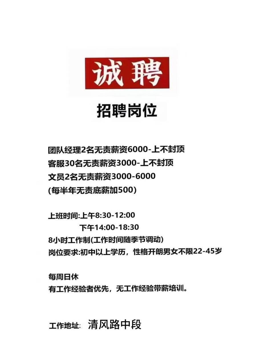 【招聘】招聘团队经理无责底薪6000+,客服无责底薪3000+